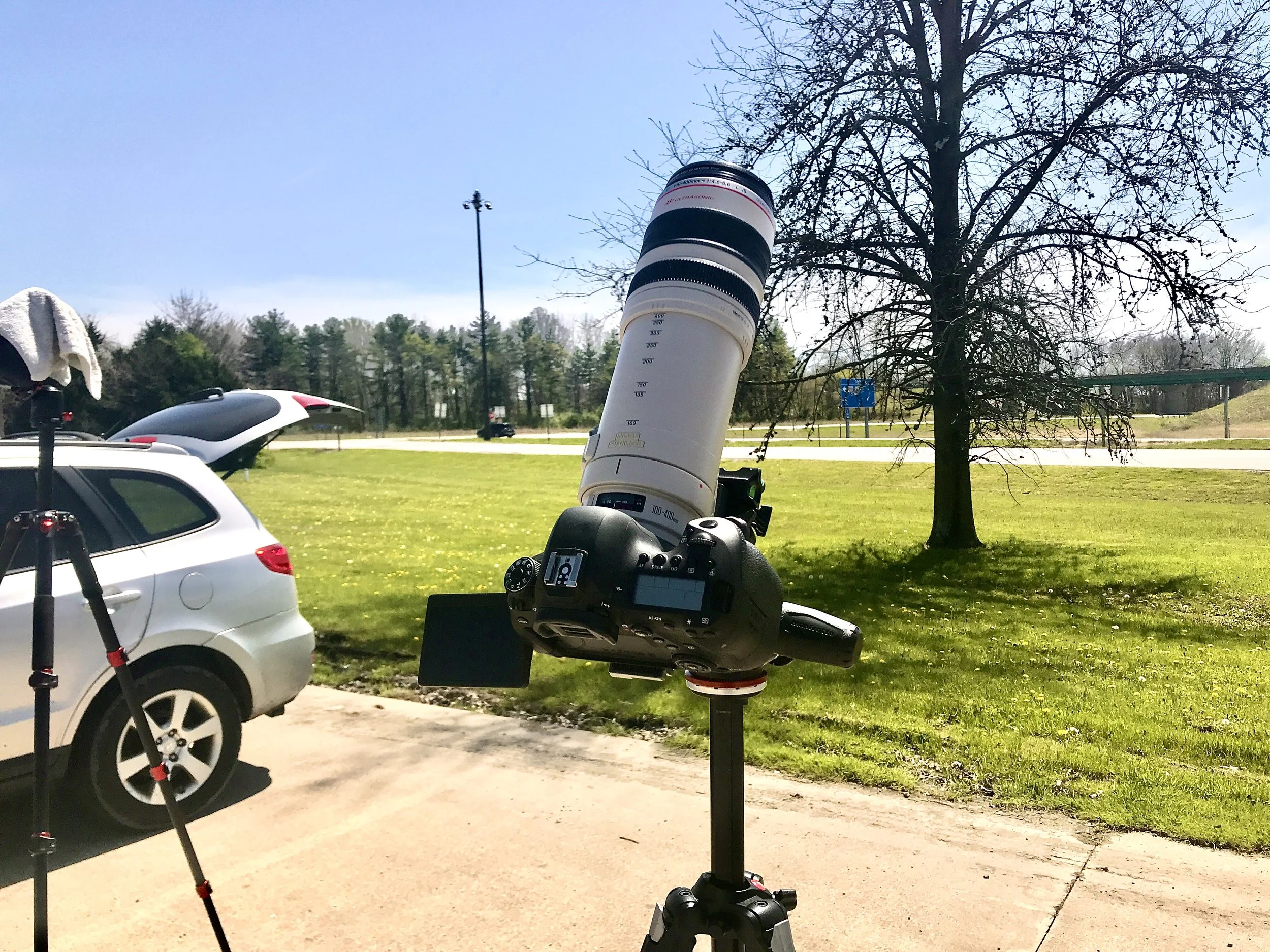 The main camera that captured the eclipse. Attached is a 100mm-400mm lens (at 400mm). The angle of the sun was at 56º so it really had to crank that camera pretty high in the sky.